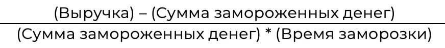 Мы можем взять пропорцию между количеством денег, которые мы заработаем, и количеством денег, которые мы вложим, — тогда мы узнаем, сколько денег нам заработает каждый вложенный рубль. Но это результат «работы» за весь период заморозки. Заморозка — это период между моментом, когда мы отдали кому-то деньги в обмен на материалы, товары, работу и моментом, когда деньги вернулись к нам через продажу этих материалов, товаров, работ.