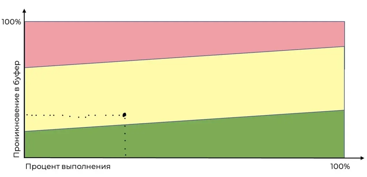 По оси X мы будем откладывать процент выполнения цепи (критической или питающей), по Y — мы будем откладывать процент проникновения в буфер. В любой момент текущий статус проекта отображается точкой с координатами (текущий процент выполнения проекта; текущий процент проникновения в буфер).