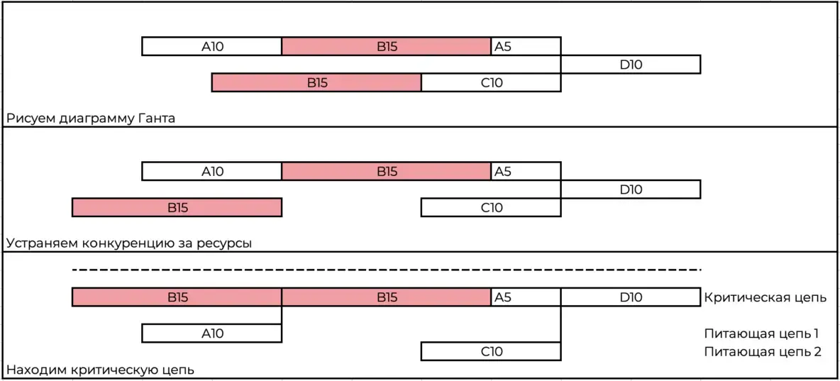 В примере ниже, после того как мы выстроили Гант проекта и расставили ресурсы (A, B, C и D) и трудоёмкости, у нас создалась конкуренция за ресурс B. Мы устранили её, изменив последовательность выполнения задач. В итоге, у нас получилась критическая цепь длиной в 45 дней и две питающих — длиной в 10 дней каждая.