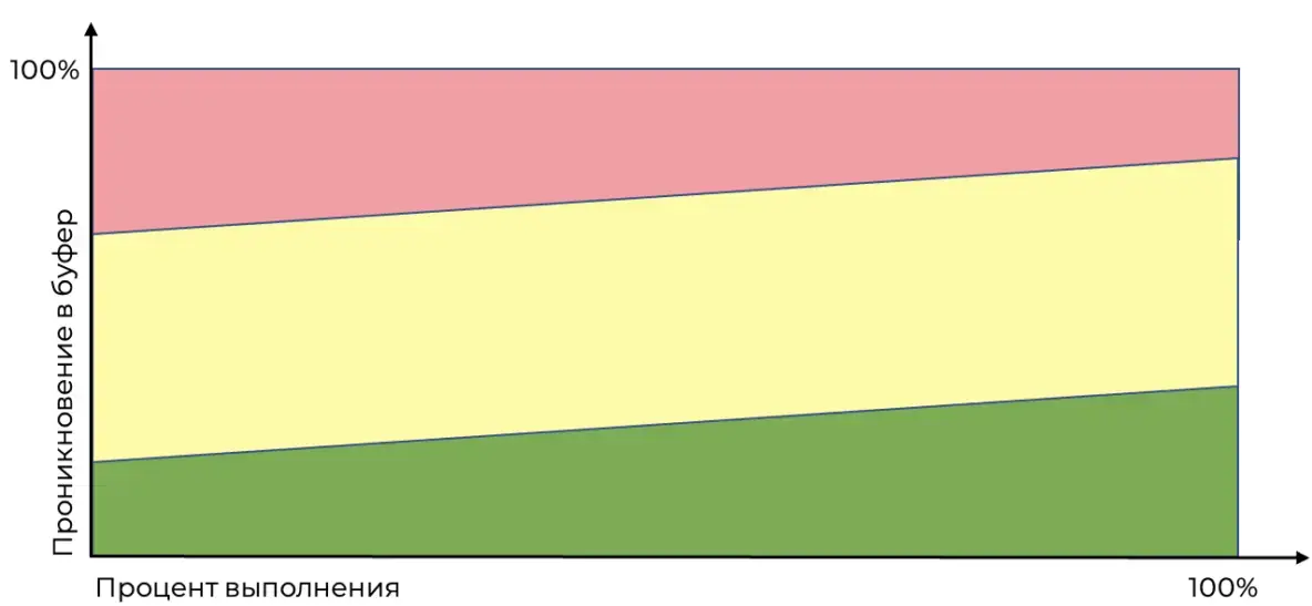 Если мы «съедим» половину буфера в начале проекта, то это довольно плохо, ещё много работы впереди и многое может пойти не так. Если мы в конце проекта использовали всего лишь половину буфера, то это отлично. Мы точно успеем. Чтобы отразить это различие, границы зон проходят под наклоном.