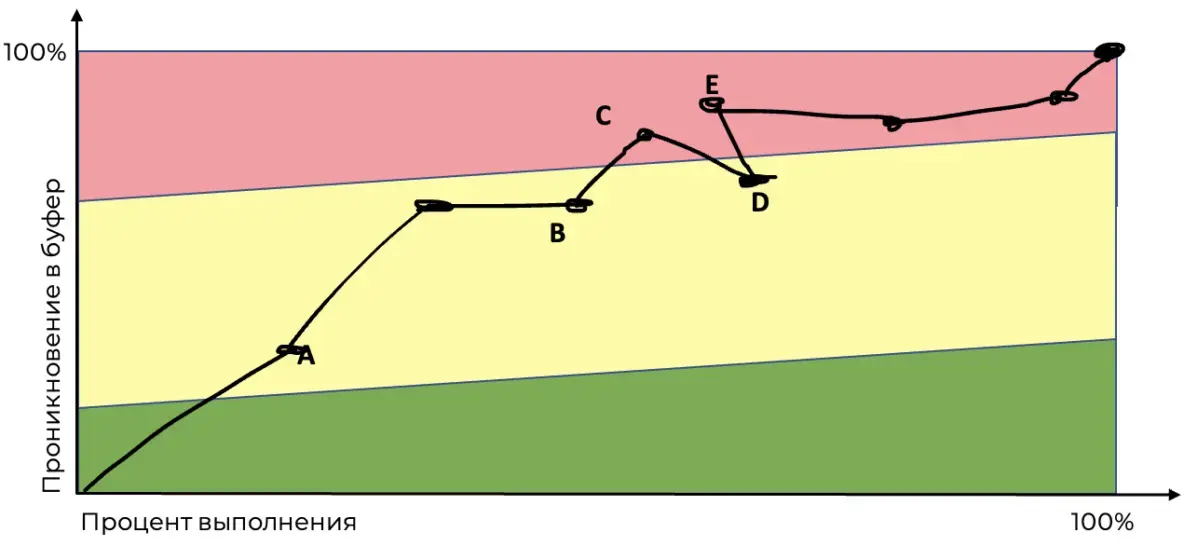 В зависимости от цвета зоны, в которую попала точка, мы считаем, что всё отлично (зелёная зона), всё нормально (жёлтая зона), либо мы в критической зоне (красная зона). Выше красной зоны начинается чёрная. Чёрная зона соответствует проникновению в буфер больше ста процентов. Это значит, что несмотря на то, что проект ещё не закончен, мы уже опаздываем.