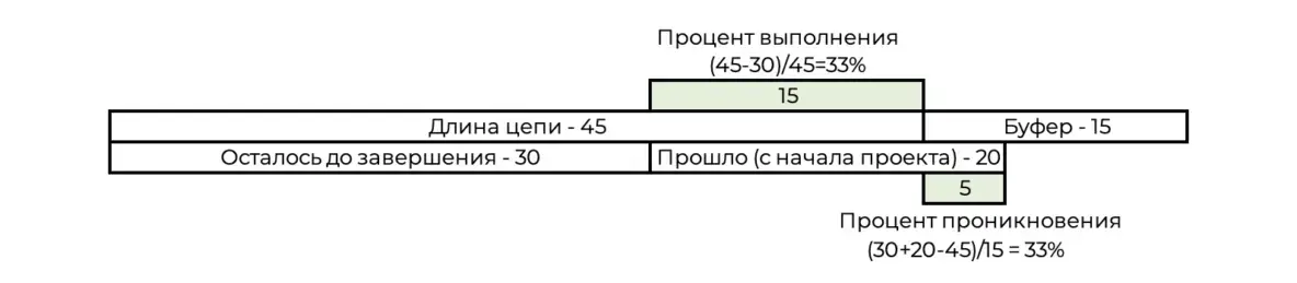 Для примера посмотрим, как будет выглядеть расчёт для проекта длиной в 60 дней. Длина цепи составляет 45 дней, в буфер мы заложили 15 дней. Уже прошло 20 дней проекта, а работы осталось на 30 дней.