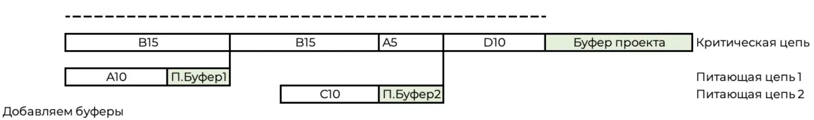 После того как у нас появился план проекта со сжатыми трудоёмкостями, мы наконец-то возвращаем в него подстраховку. Подстраховка в нашем решении называется Буфер. «Буфер проекта» мы добавляем в конце критической цепи. В местах, в которых питающие цепочки подходят к критическому пути, мы добавляем «Питающие буферы». Буфер проекта защищает срок выполнения проекта, питающие буферы защищают критическую цепь.